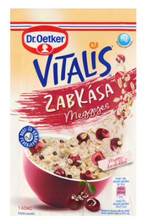 Zloženie: ovsené vločky 68%, cukor, sušené odstredené mlieko, kukuričný škrob, sušené višne 2,5%, kukuričná vláknina, jedlá soľ, prírodná aróma, horečnaté soli kyseliny citrónovej, regulátor kyslosti (kyselina citrónová).