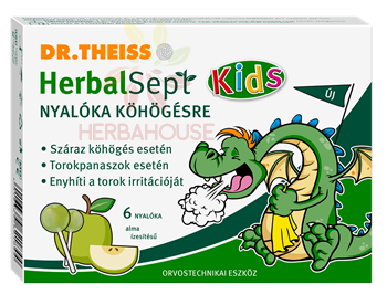Dr.Theiss HerbalSept Kids lízanky na kašeľ pokrývajú sliznicu ochranným filmom a tým zmierňujú kašeľ. Zabraňujú podráždeniu vplyvom suchého, chladného alebo kontaminovaného vzduchu, čím redukujú frekvenciu výskytu kašľa. Dr. Theiss HerbalSept Kids KAŠEĽ zvyšujú hydratáciu sliznice hrdla a uľahčujú vykašliavanie hlienu. Svojím zmierňujúcim účinkom obnovujú rovnováhu podráždenej sliznice. Koreň ibišu obsahuje sliz, ktorý pokrýva rovnomerne sliznicu ústnej dutiny a hrdla, zvlhčuje ju a chráni pred podráždením. Zintenzívnením pohybu riasiniek (cílií) sliznice dýchacích ciest dúška tymianová podporuje ich čistenie.