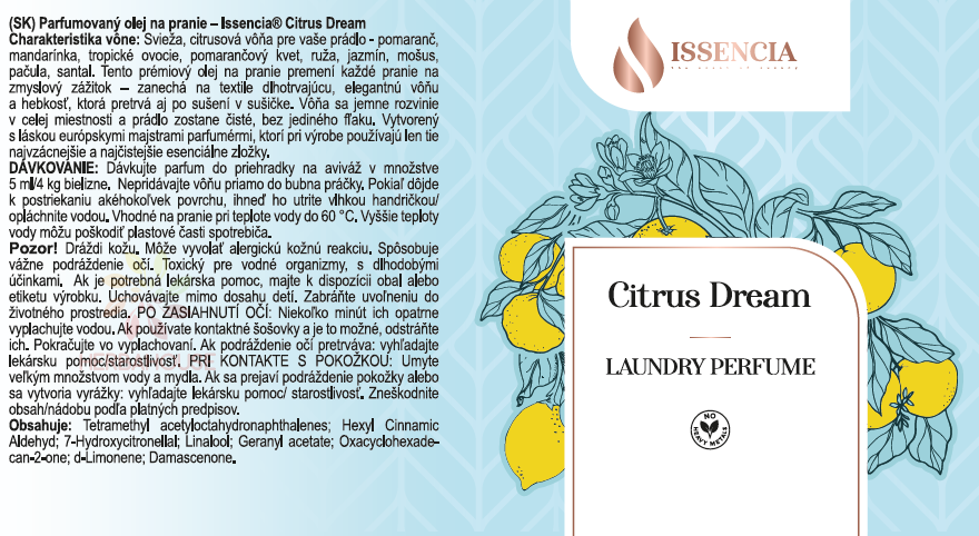 Issencia Olej do prania – Citrus Dream: more sviežosti. Inšpirovaný vôňou Michael Kors Sporty Citrus. Doprajte svojmu prádlu letnú náladu. Vyperte ho v citrusovom mori. Vôňa tropického ovocia, šťavnatých citrusov a jazmínu premení každé pranie na záplavu sviežosti.