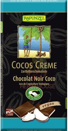 Original švajčiarska horko mliečna čokoláda s kokosovou náplňou, bez pridaného mlieka s ryžovým sirupom, vhodná aj pre vegánov.